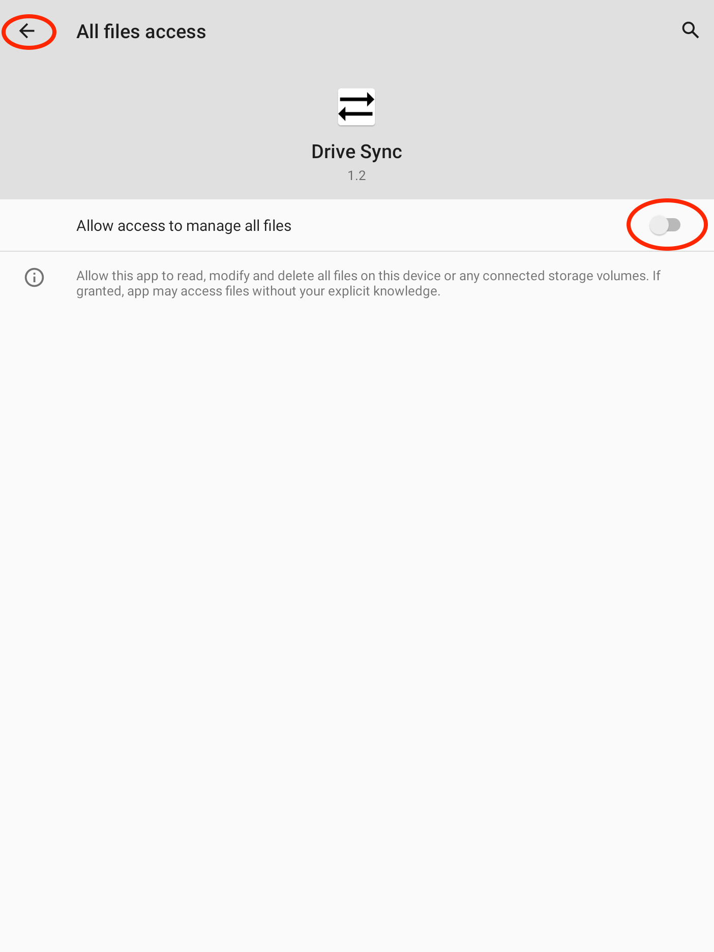 From here you need to click on “Drive Sync”, enable “Allow access to manage all files” and then tap the back arrow in the top left twice to return to the app.