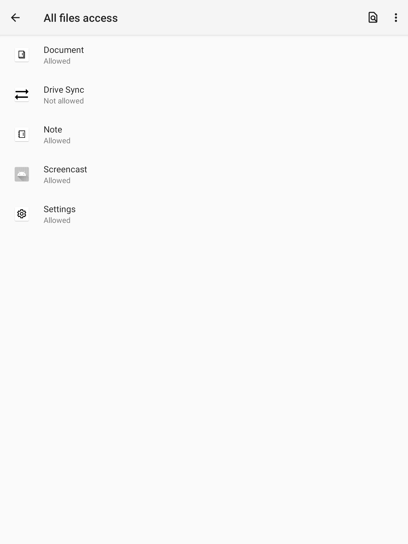The first time you open the app, you will be asked to grant it permission to manage files. This allows Drive Sync to read and write from your INBOX/EXPORT directories and connected USB drives. After tapping “Grant permission” you’ll be taken to the “All files access” settings screen: